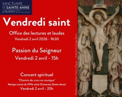 Le soir du Vendredi saint, le sanctuaire de Sainte-Anne-d'Auray propose un concert spirituel, en forme de chemin de croix, avec la participation du P. Thierry Félix (prédication), de la Camerata Sainte-Anne (Véronique Le Guen, direction), d’Emmanuel Pottier (orgue).
